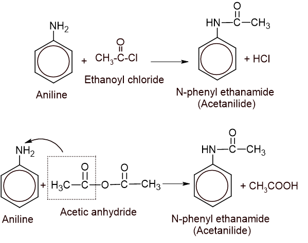 3. Acylation: Aniline reacts with acid chloride or anhydride to give N-phenyl ethanamide (acetanilide).