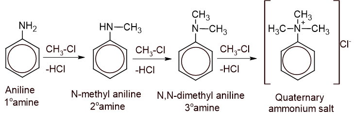 2. Alkylation: Aniline reacts with an alkyl halide gives a mixture of secondary, tertiary amine and quaternary ammonium salt.