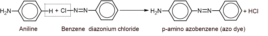 6. Coupling reaction: Aniline reacts with benzene diazonium chloride in slight acidic medium to give p-amino azobenzene which is also known as azo dye.