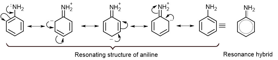 1. Basicity of aniline: Aniline is basic in nature due to the presence of lone pair of electrons on a nitrogen atom. However, it is less basic than ammonia and aliphatic amines because its lone pair of electrons present in the nitrogen atom takes part in resonance.