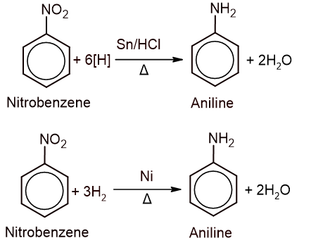 1. From nitrobenzene: Aniline is prepared either by the reduction of nitrobenzene with granulated tin and concentrated hydrochloric acid or catalytic hydrogenation.