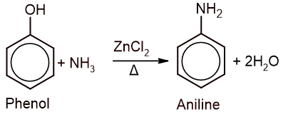 2. From phenol: When phenol is reacted with ammonia in presence of zinc chloride at 300°C and high pressure, aniline is formed.
