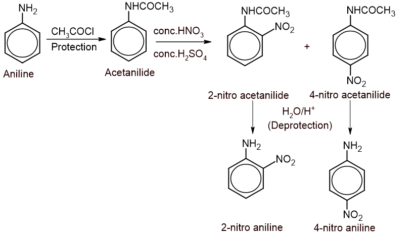 2. Nitration: Direct nitration of aniline cannot be carried out because conc. nitric acid being a strong oxidizing agent oxidizes aniline into the various oxidized products. So, the amino group is first protected by acylation before nitration followed by hydrolysis to regenerate the amino group.