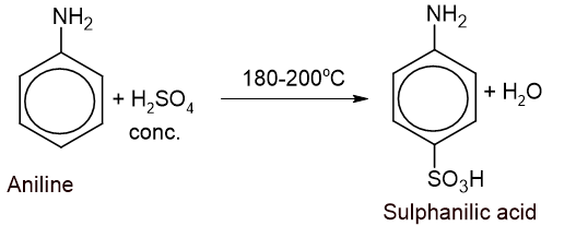 3. Sulphonation: Aniline is heated with conc. sulphuric acid at 180-200°C for 4-5 hours to give p-amino benzene sulphonic acid (sulphanilic acid).