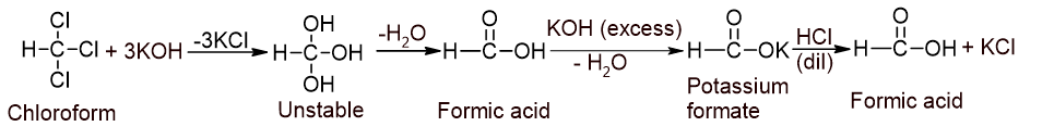 5. Action with NaOH or KOH: Chloroform is heated with aqueous KOH or NaOH followed by acidification that gives formic acid.