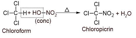 3. Action with nitric acid: Chloroform reacts with concentrated nitric acid to give chloropicrin which is used as insecticides and as war gas or tear gas.