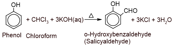 6. Action with phenol: Chloroform is heated with phenol in presence of aq.KOH followed by acidification gives salicylaldehyde as the major product. This reaction is called the Reimer Tiemann reaction.