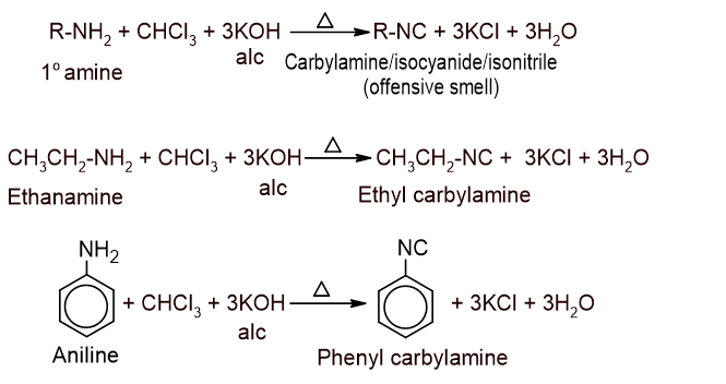 7. Action with primary amine: Chloroform is heated with primary amine in presence of alcoholic KOH to give isocyanide or carbylamine which is a bad-smelling compound. This reaction is known as carbylamine test or Isocyanide test since it is used to detect both chloroform as well as primary amine.