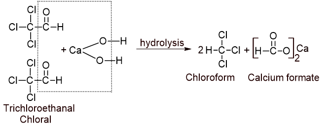 Chloroform is prepared in the laboratory by heating ethanol or acetone with an aqueous bleaching powder paste. Bleaching powder acts as oxidizing, chlorinating, and hydrolyzing agent.